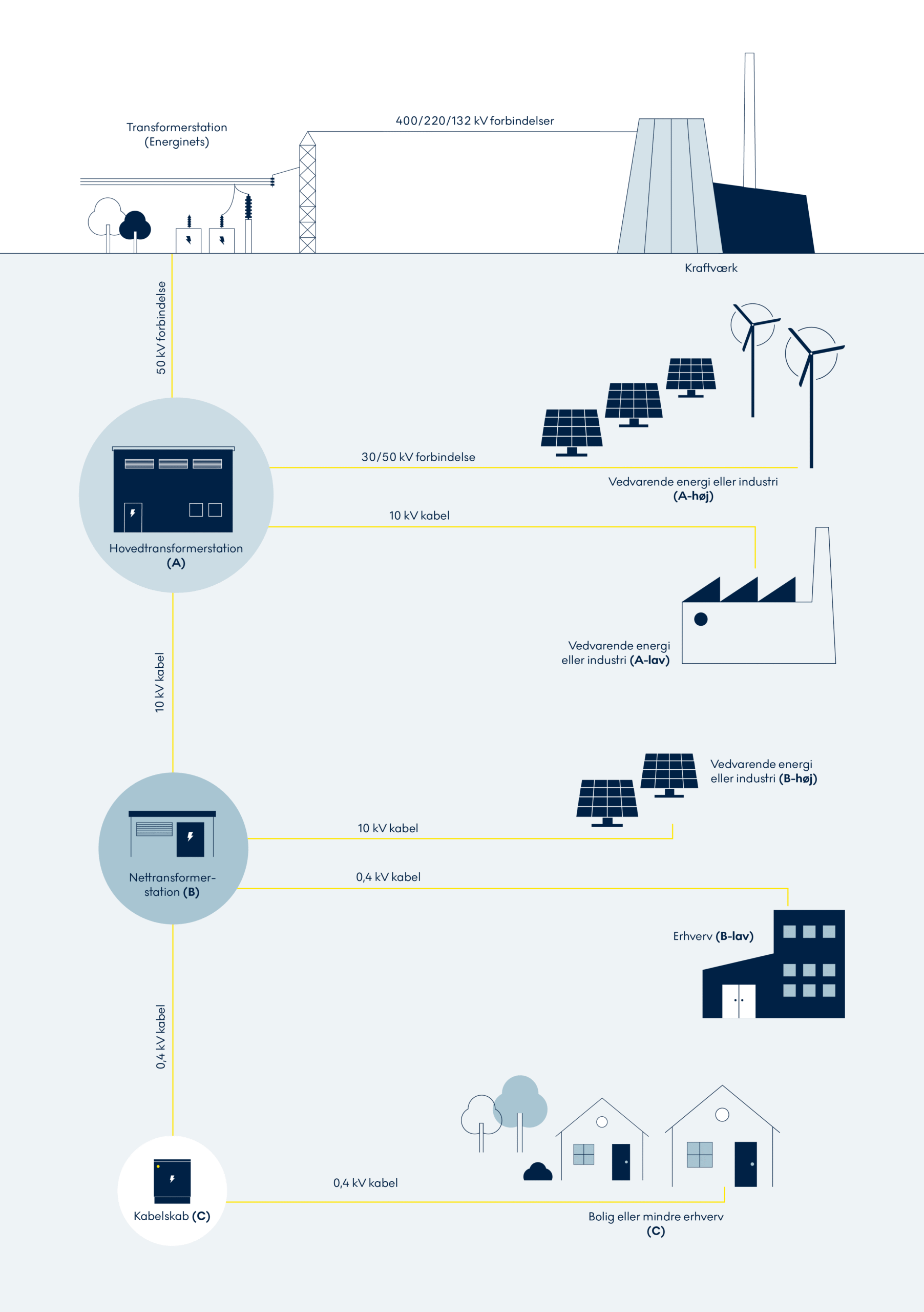 Der findes tre overordnede kundekategorier: A-kunder, B-kunder og C-kunder. Din kundekategori afhænger af, hvor du er tilsluttet i elnettet. Du kan derfor ikke selv vælge, hvilken kundekategori du tilhører.